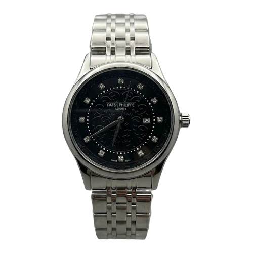 باتيك فيليب ساعة رجالية – فضي / أسود / سوار معدني (قرص مرصع)