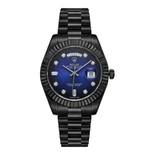 ساعة تناظرية باللون الأسود مع قرص أزرق، نافذة لليوم عند موضع الساعة الثانية عشرة ونافذة تاريخ عند موضع الساعة الثالثة بعدسة تكبير. تتميز بسوار معدني ومؤشرات ساعات مرصعة وتصميم إطار مسنن.